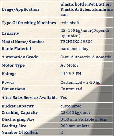 TECHMKS plastic shredder is suitable for the crushing and recycling of large-diameter plastic barrels and waste plastic products. The double-shaft shredder is suitable for the crushing and recycling of large-diameter plastic barrels, PE plastic barrels, PP plastic barrels and other plastic barrels of different thickness, height and diameter. The cutter of the plastic shredder can be customized by the discharge size, and the output can be provided according to the user's requirements.